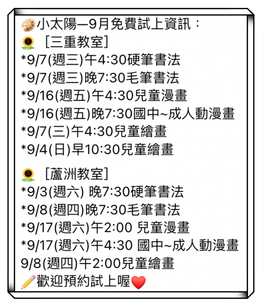 | 蘆洲時段: | 週四/週六 晚上7:30 (毛筆/硬筆) |